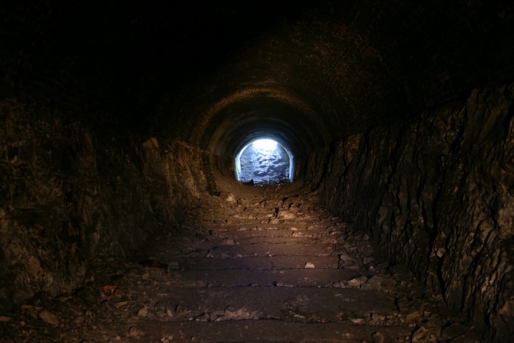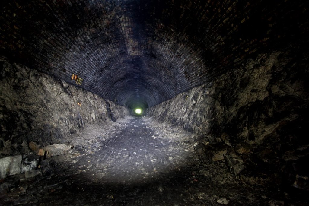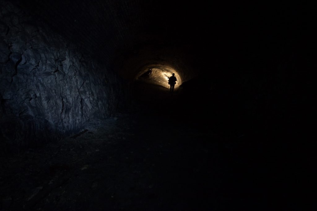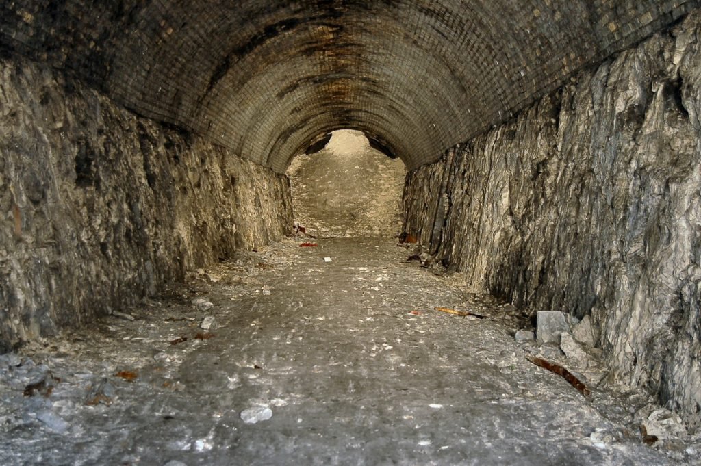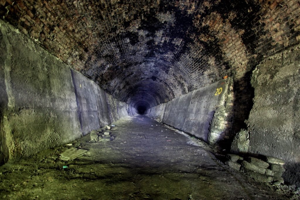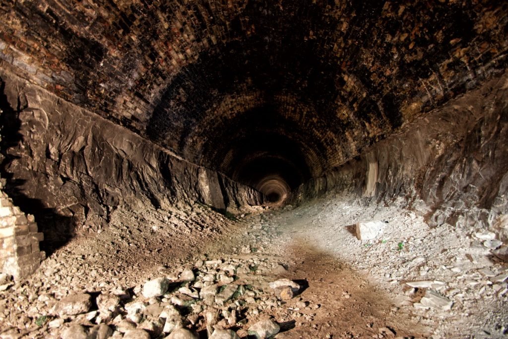 Little information about this tunnel is available, for example when it was built or when it was shut but it is known the tunnel was dug to access a large chalk pit dug into the hillside below Bluebell Hill. The tunnel is approximately 550 yards long and is in a good condition apart from the chalk finding its way back into the tunnel via the air shafts. Access was via the southern portal, and about halfway along the tunnel, we came to a wall of chalk. Just to the right, you can crawl through it, then comes the next obstacle which is a 10 feet wall. There are two ways through this, either over or under the wall. Once past the wall, you can easily walk to the other end.
