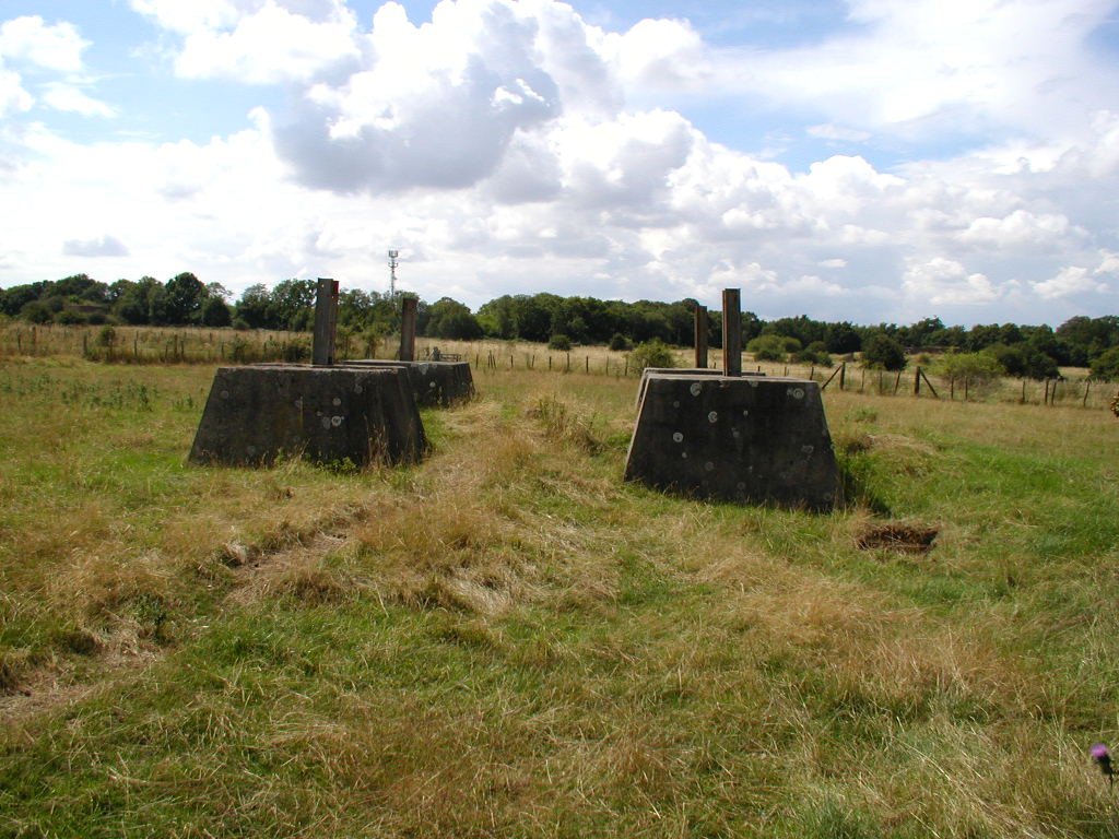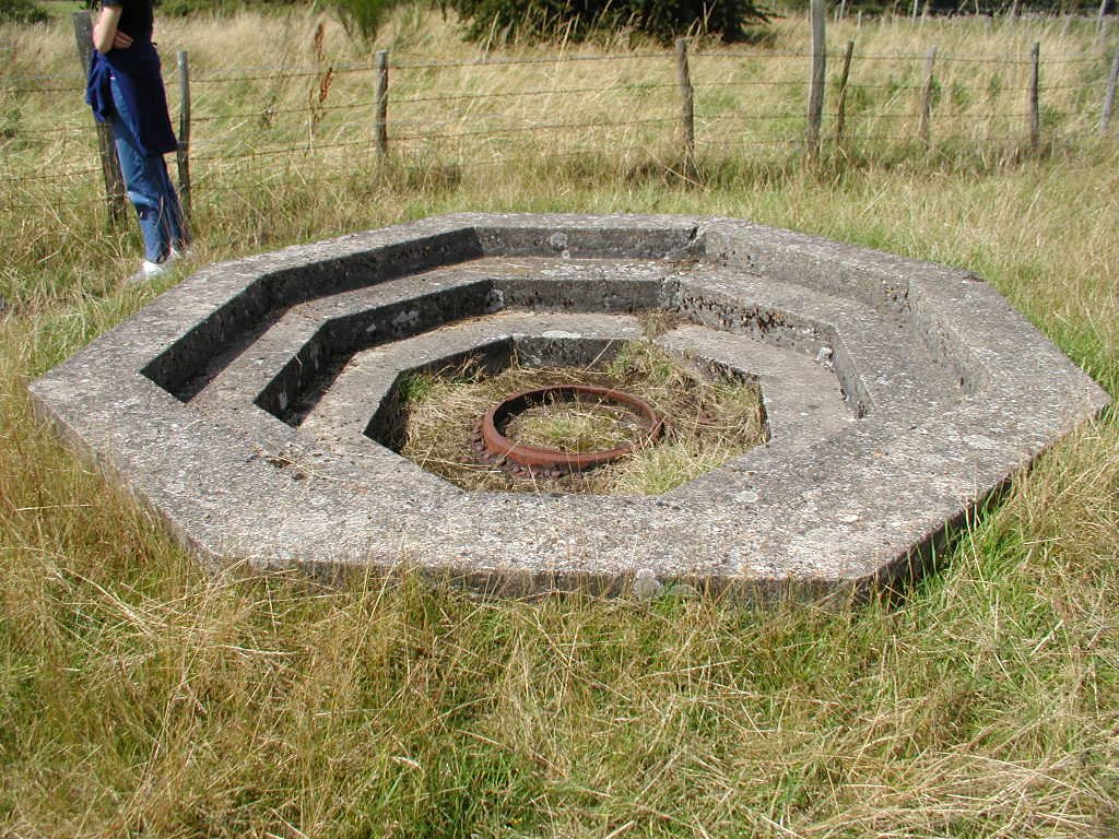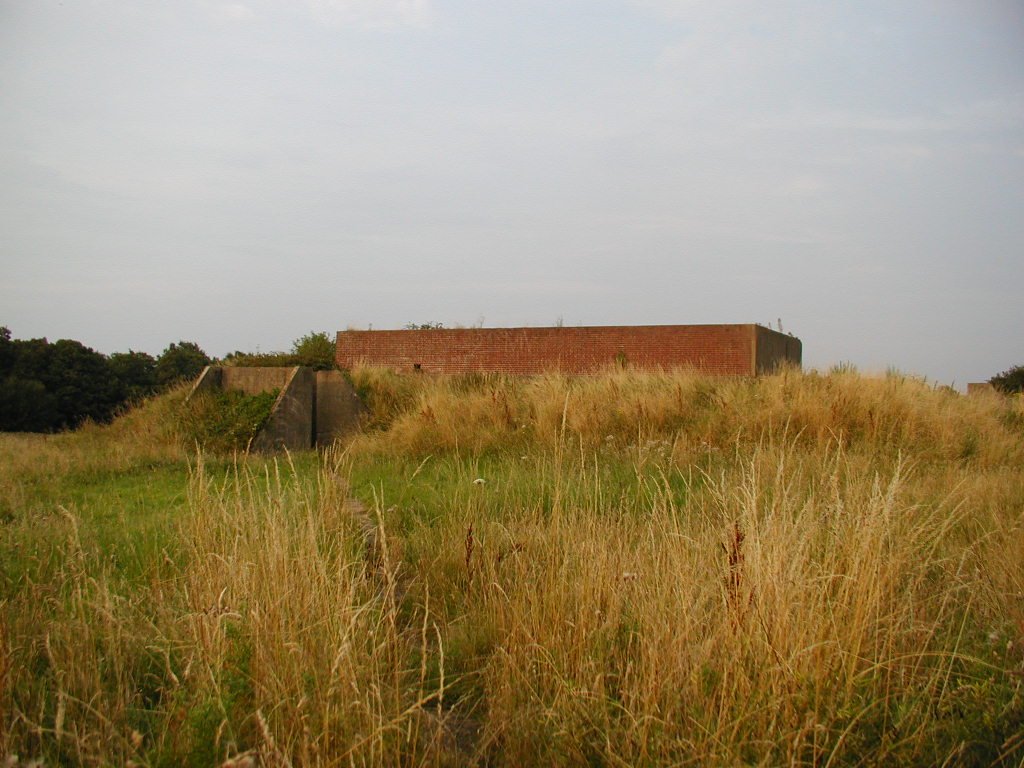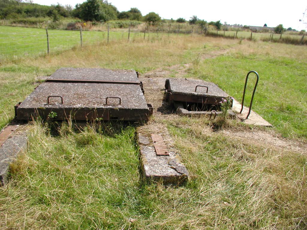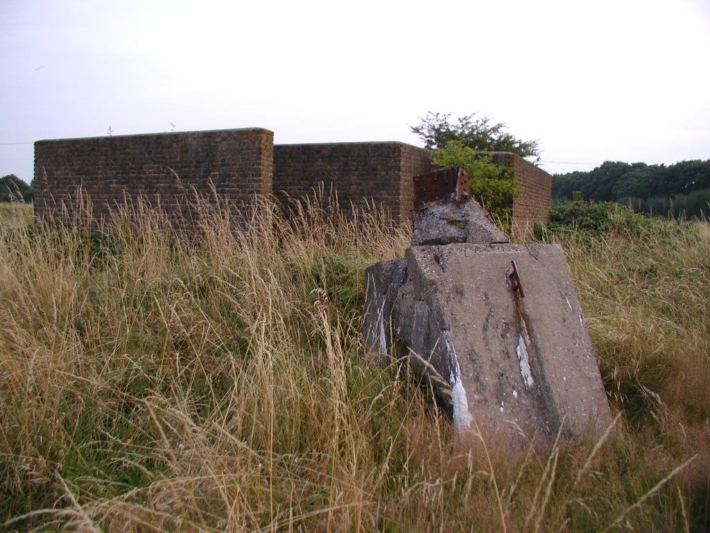Defence of the site included an Ack Ack tower that housed a 40mm Bofors gun as well as a tripod-mounted Lewis gun. Near to this structure, the remains of the concrete supports for the receiving towers can still be seen. However, the most noticeable feature is the main control block. The blast walls around the building have soil banked up against them. The entrance into the block would have been a gas proof door. It was heavily barred and when closed, a thin rubber gasket fitted into the frame would have made it a gas tight seal. The first room you enter is the largest and would have been the main operations room. A large trench-like pit runs through the building. Looking through the doorway on the other side of the room, there is a small room immediately to the right. This was the air lock, and next door was the anti-gas filter room. A large frame is still in place on the wall, and would have supported the filtering mechanisms. A large metal pipe comes into this room, and the same room seen from outside will show you the air intake. Opposite these rooms were the controllers office and the toilet. The kitchen and pantry are the rooms that form the other end of the block.