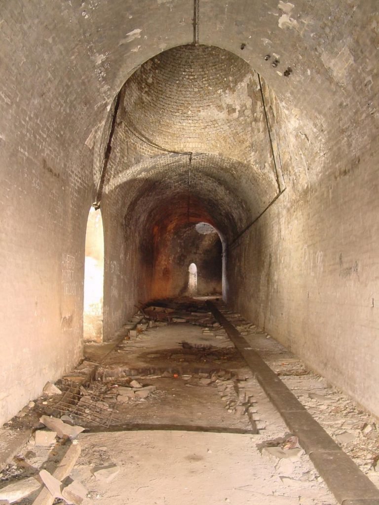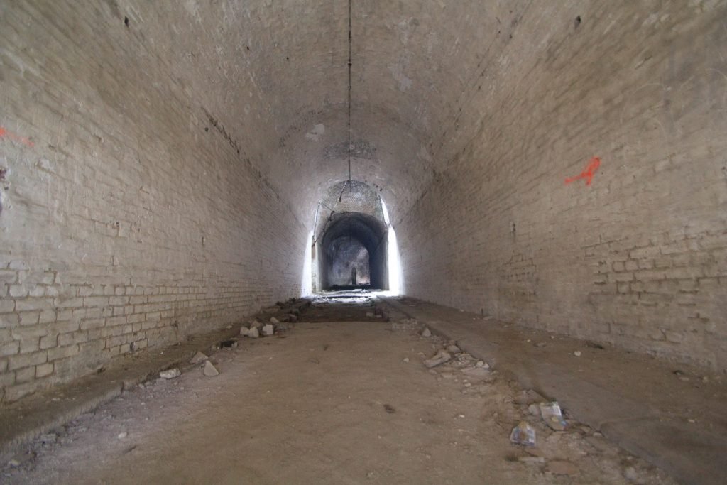 The two bridges crossed the twin ditches (or lines), which were separated by an earth bank – the tenaille. Neither bridge was fixed. The first of the two had a drop-down section hinged at the tenaille end, while the second had a section that could be raised. The roadway cut through the tenaille was ‘S-shaped, so that artillery fire could not be brought to bear on the entrance to the tunnel from the approach road.