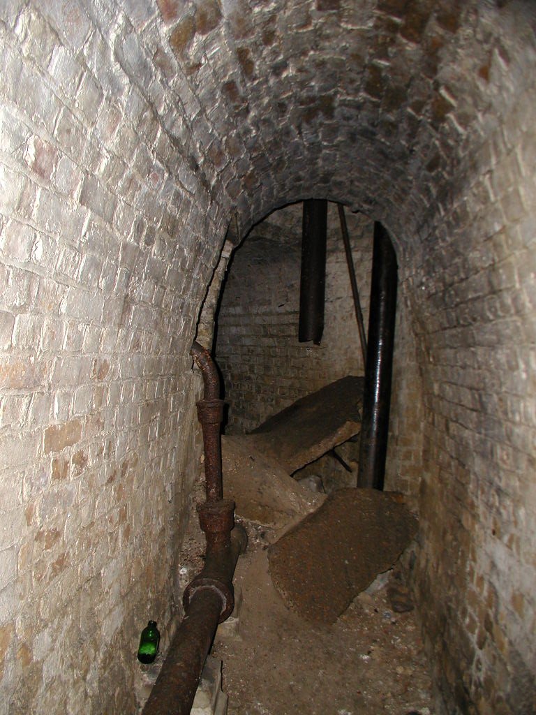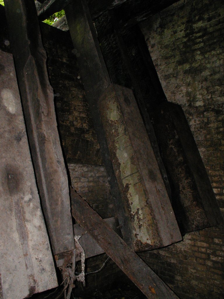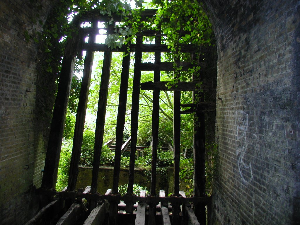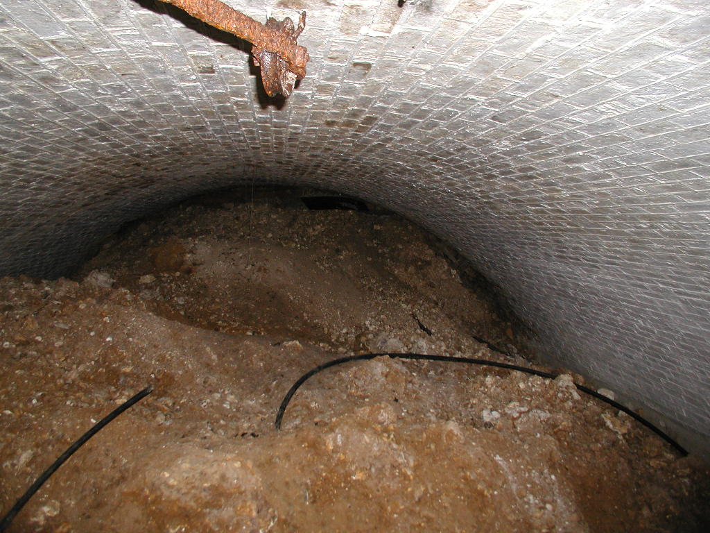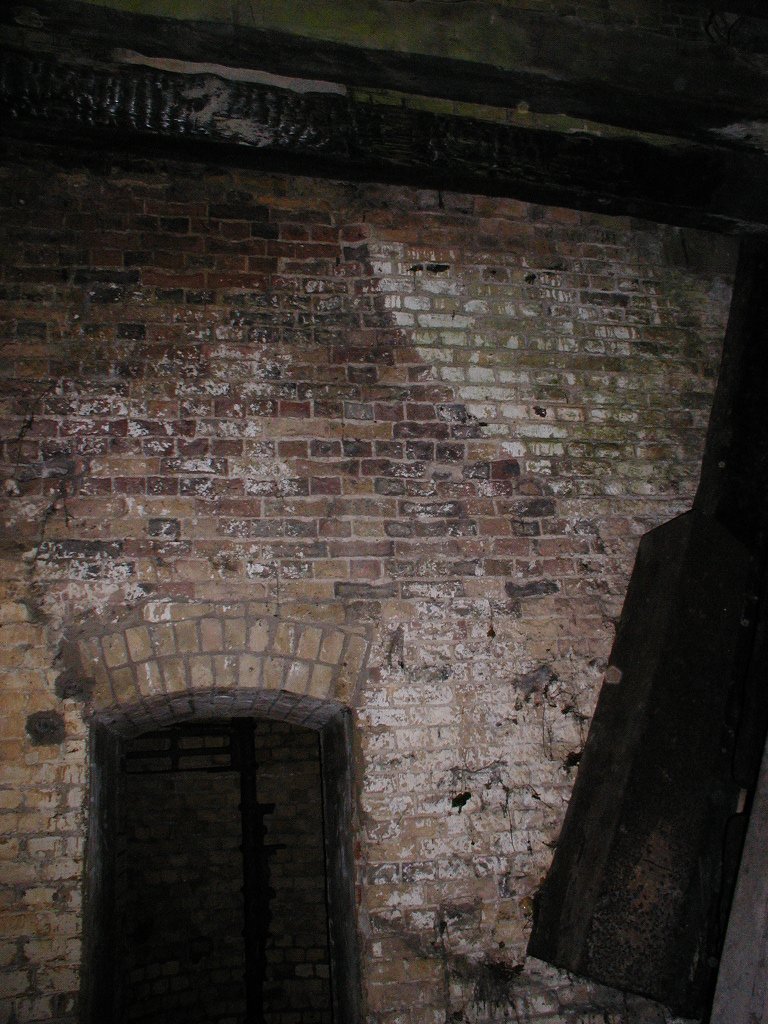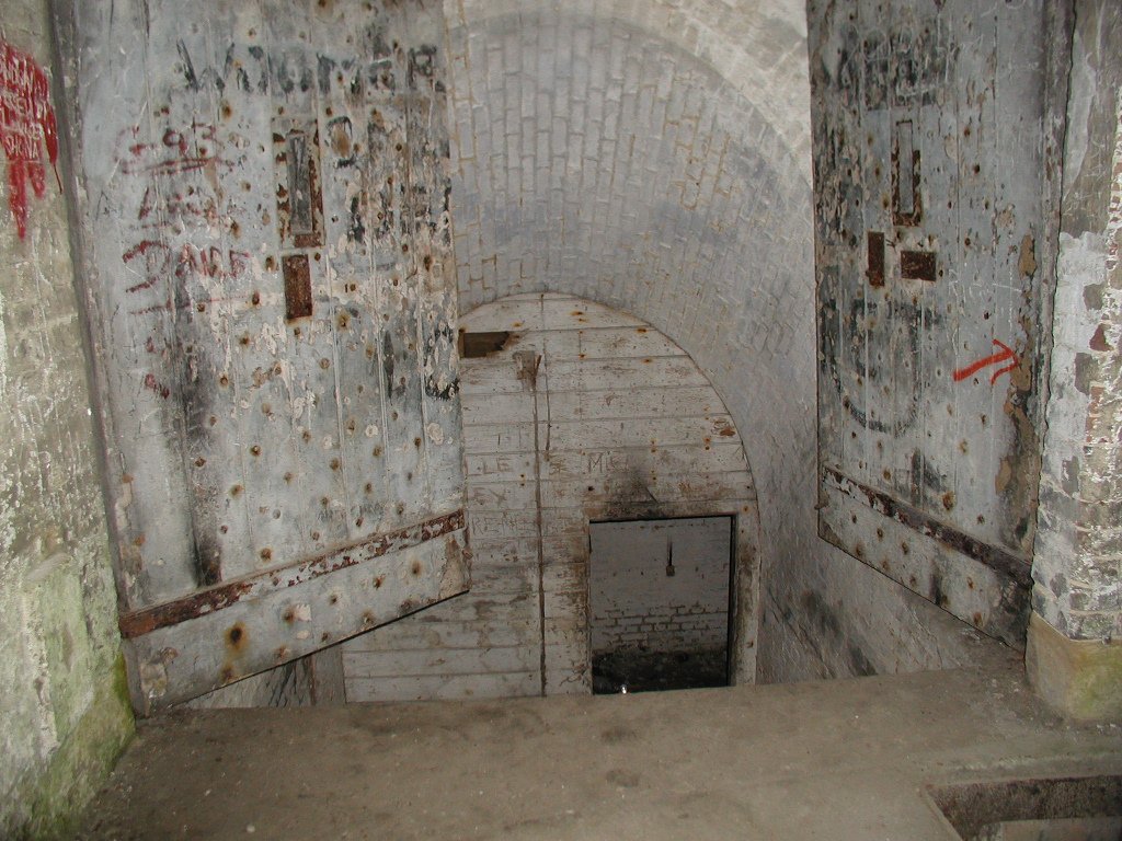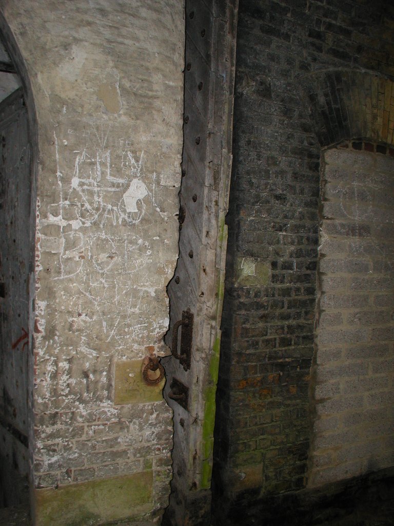 Having crossed the two bridges, the road entered a tunnel with a pair of massive doors at the outer end. These slid on rails from deep slots on either side of the tunnel and did away with the obvious weakness of hinges. The tunnel then turns sharp left, runs straight for 50m or so, and then turns right towards the inner gateway. The road bed of the tunnel was laid with 6” cubes of oak, probably to guard against sparks.